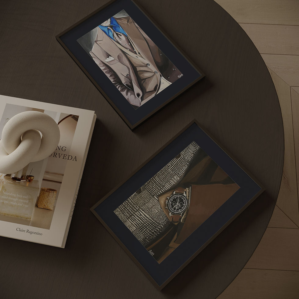 Inspired by the refined world of masculine tailoring, every artwork captures the soul of sartorial expression through brushstrokes, textures, and detail.